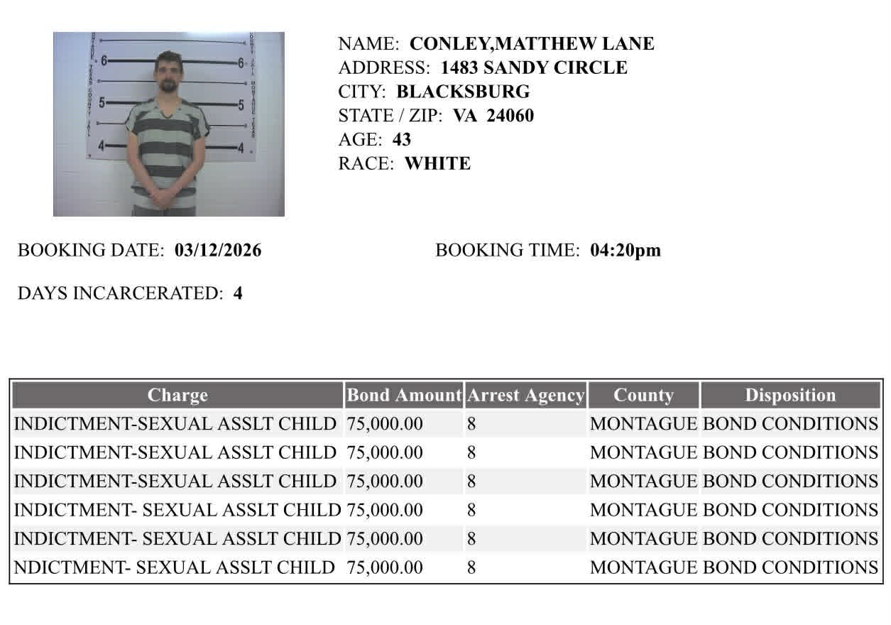 Conley was booked into the Montague County Jail, and his bond was set at $450,000—$75,000 for each charge.
